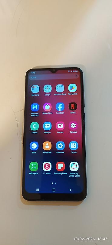 Telefonun ekranında damcı‑notch ön kamera, alt hissədə üç düyməli naviqasiya paneli görünür. Samsung tətbiqləri, Google servisləri və Play Market quraşdırılıb. Arxa tərəfdə üçlü kamera bloku və LED flaş yerləşir. Gövdə erqonomik, tutuşu rahatdır; gündəlik istifadə, sosial şəbəkə və multimedia üçün münasibdir.