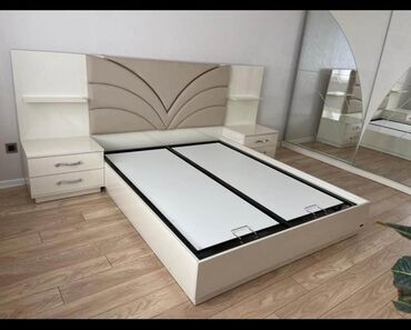 Şəkillərdə gördüyünüz bütün elementlər dəstdə uyğundur: qaldırılan saxlama qutulu çarpayı, iki tumbalı başlıq, sürgülü güzgülü şkaf, 4 çekmecəli komod-güzgü.