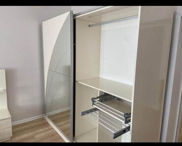 - Güzgülü paltar dolabı: sürgülü qapılar, dekorativ güzgü naxışı; geniş daxili saxlama üçün