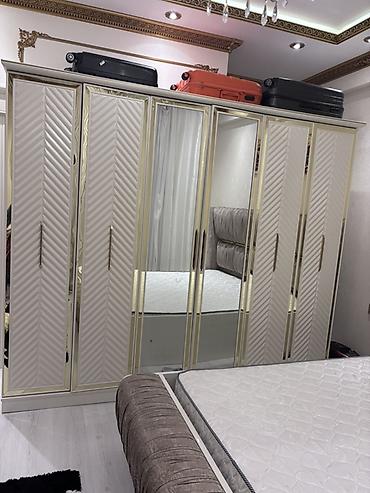 - 6 qapılı paltar dolabı: ortada böyük güzgü paneli, qapılarda dekorativ diaqonal relyef, qızılı rəngli haşiyə və uzun metal tutacaqlar. Geniş asılqan və rəf bölmələri üçün nəzərdə tutulmuşdur.