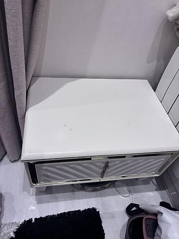 - Tumba (yataq yanı şkafı): ağ rəng, diaqonal teksturalı ön panel, güzgü effektli qızılı çərçivə, mərkəzdə metal tutacaq.