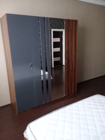 Yataq otağı mebel dəsti Tərkibi: - 4 qapılı şkaf: ortada tam boy güzgü, yanlarda geniş bölmələr; uzun metal tutacaqlar, tünd ağac rəngində korpus, açıq rəng çərçivə detalları. - Çarpayı: tünd rəng...