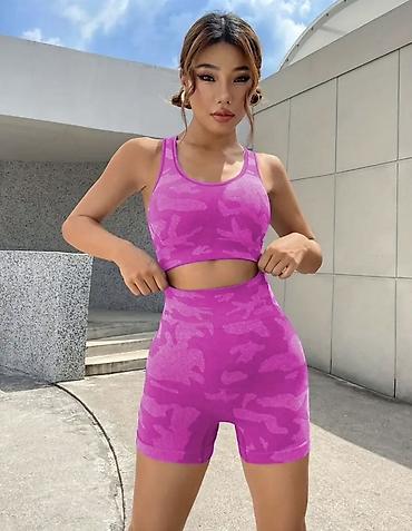 - Qısa top + yüksəkbell şort dəsti (şəkildə bənövşəyi/çəhrayı kamuflyaj naxışlı)