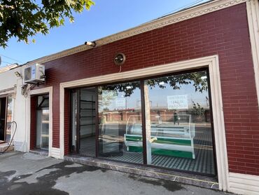 Kərpic fasadlı və böyük vitrin pəncərələri olan kommersiya obyektidir