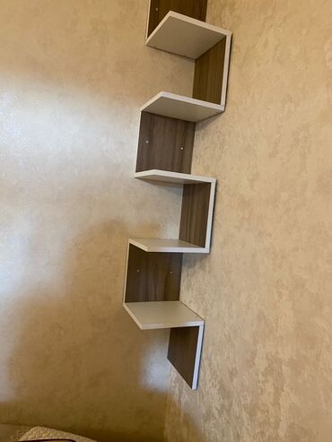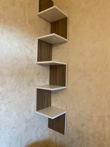 Künc üçün divar rəfi – Z formalı dizayn - Material: ağac teksturalı laminat/MDFlam (qəhvəyi ton) - Quruluş: Z formalı modul; divarın küncünə bərkidilir - 5 ədəd açıq polka – dekor, kitab, çiçək, s...