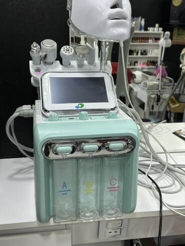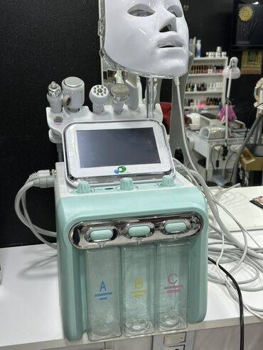 - 7-in-1 platforma: hidrodermabraziya (A/B/C məhlul çənləri), ultrasəs başlıq, soyuq/isti çekiç, radiofrekans başlıq (RF), mikro-cərəyən/biocurrent, vakuum başlıq və LED maska.