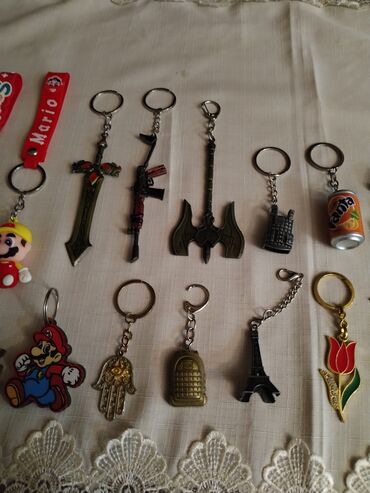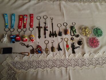 - Metal və plastik kolleksiya açarlıqları: qılınc, baltalı-qılınc, tüfəng və tabanca formalı modellər; Eifel qülləsi, qala/şato, qranat, dəbilqə; fatimə əli (Hamsa), lalə motivli qızılı açarlıq, klassik medalion tipli nishan; mini radio/cihaz, qüllə və digər tematik fiqurlar.