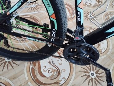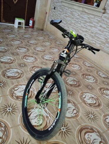 Velosiped – dağ tipli, 26" təkərli - Rəng: qara, yaşıl yazılı dizayn - Çərçivə: dağ velosipedi geometriyası, aşağı enişli çərçivə - Asqı: ön amortizatorlu çəngəl - Sürətlər: çoxpilləli ötürücü sis...