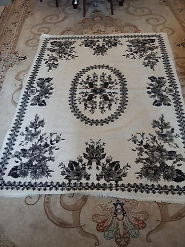 Xalça – klassik naxışlı, açıq boz/krem fon üzərində qəhvəyi motivlər. - Ölçü: təxmini orta ölçülü (otaq və dəhlizlər üçün münasib). - Dizayn: mərkəzdə medalion kompozisiyası, kənarlarda dekorativ z...