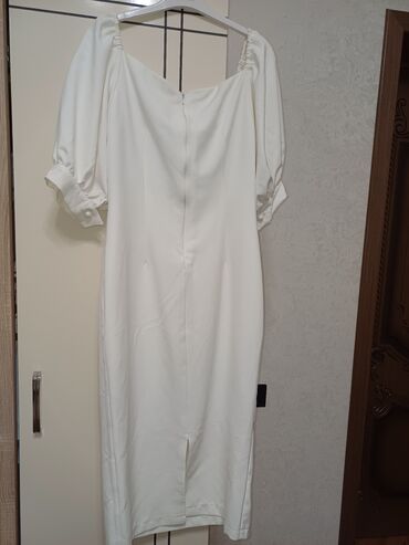Ağ rəngli, zərif midi/uzunluqda paltar. - Üst hissəsi kvadrat dekolte ilə - Şişkin qısa qollar (rezinli manjet) - Ön hissədə dekorativ, parça ilə örtülü düymələr - Arxa hissədə gizli fermuar - Düz...