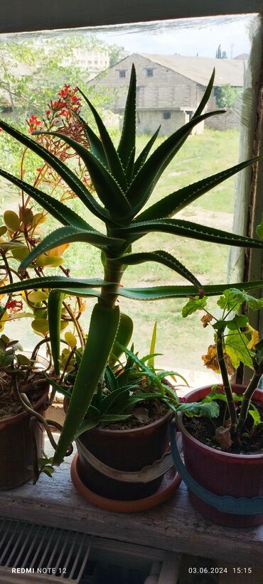 Aloe vera (sukkulent) – bərk və ətli yarpaqlı dekorativ bitki - Növ: Aloe vera (tikanlı kənarlı, dik yarpaqlar) - Qab: Dairəvi dibçəkdə, torpaq qarışığı ilə - Ölçü: Uzun, çoxgövdəli formalaşma; gö...