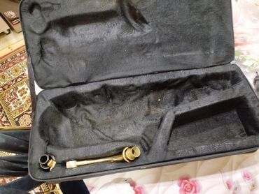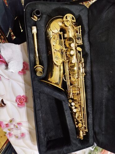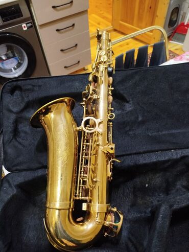 Qızılı rəngli alto saksofon – tam komplekt.