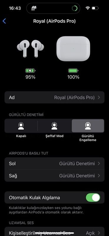 - Ekran görüntüsünə əsasən qulaqlıq batareyası 95%, qutu 100% göstərici ilə işlək