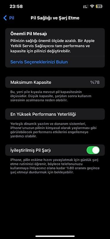 - Parametrlər > Pil bölməsində “Maksimum Kapasite: 78%” göstərilir