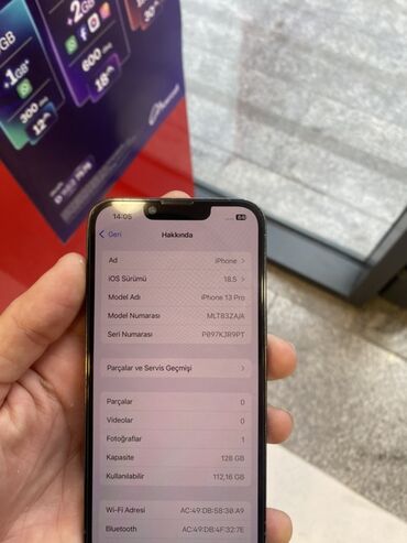 Telefonun “Haqqında” bölməsinin şəkillərində model adı və yaddaş həcmi təsdiqlənir. Arxa hissədə üçlü kamera modulu və LiDAR skaneri görünür. ProMotion ekranda hamar keçidlər, güclü A15 Bionic isə yüksək performans təmin edir. MagSafe aksesuarları ilə uyğun işləyir. 128 GB daxili yaddaş gündəlik istifadə və multimedia üçün kifayət edir.