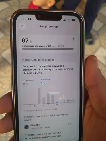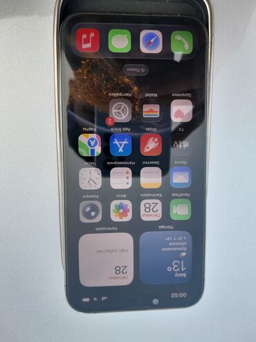 Telefon aktiv şəkildə işlək vəziyyətdədir: ekran görüntülərində ana ekran, batareya statistikası və kamera tətbiqi görünür. iOS interfeysi rus dilində quruludur, istənilən dilə dəyişmək mümkündür.