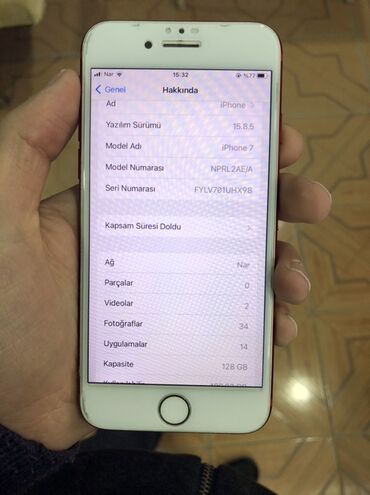 Şəkillərdə cihazın “Haqqında” və “Pil Sağlığı” bölmələrinin məlumatları göstərilib. Qırmızı arxa paneli və ağ ön paneli ilə xüsusi Product(RED) dizaynıdır. 128 GB yaddaş gündəlik istifadə və çoxsaylı tətbiqlər üçün kifayət edir. Batareya sağlamlığı 100% olaraq görünür. iOS 15.8.5 ilə işləyir.