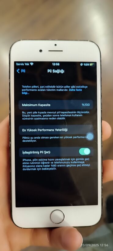 - Batareya: “Pil Sağlığı” bölməsində Maksimum Kapasite 100% göstərilir; “En Yüksek Performans Yeterliliği” aktiv; “İyileştirilmiş Pil Şarjı” açıq