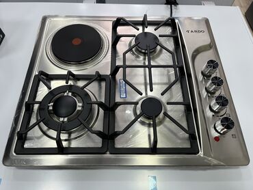 Quraşdırılan kombinə plitə – qaz + elektrik - 4 göz: 3 qaz ocağı + 1 elektrikli disklə - Şüşə səth, möhkəm tökmə dəmir qəfəslər - Sol aşağıda güclü qaz ocağı, sağda orta və kiçik gözlər - Sol yuxa...