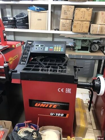 - Unite U-100 təkər balans aparat: rəqəmsal panel, avtomatik ölçü daxiletmə düymələri, çəki yerləşdirmə göstəriciləri, CE/EAC markalı. Yüngül və orta sinif disklərin balanslanması üçün uyğundur.