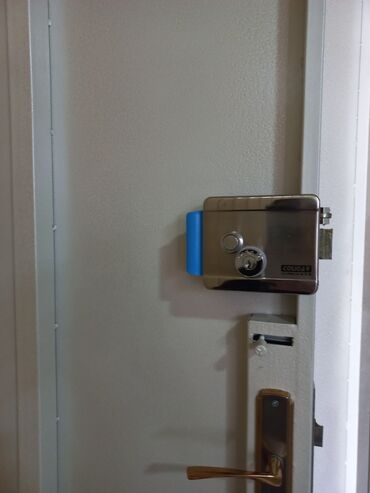 Quraşdırılmış vəziyyətdə təqdim olunan tam işlək domofon-kilid həlli. Markalar şəkillərdə göründüyü kimidir: BCOM monitor və kameralı zəng paneli, COUGAR elektromexaniki kilid.