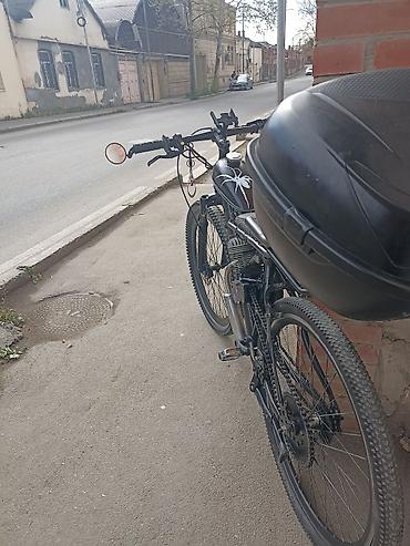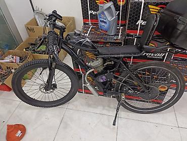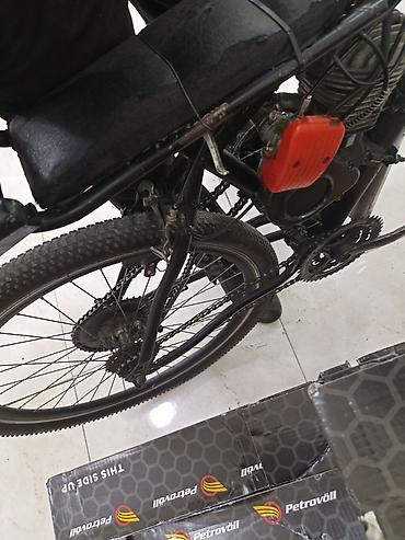 Mühərrikli velosiped - Çərçivə: klassik dağ velosipedi tipli, qara rəngdə - Mühərrik: benzinlə işləyən daxiliyanma mühərriki (2T tipli görünür), yanacaq çəni üst boruda - Egzoz sistemi: yan tərəfd...