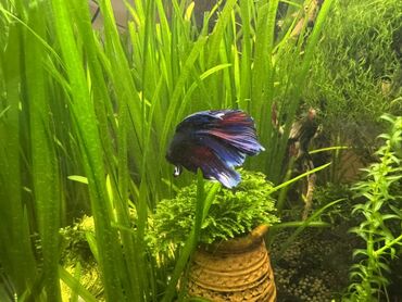 Betta (Siam döyüşçü balığı) – erkək, qırmızı-göy-qara rəng keçidləri, uzun və dalğalı quyruq/üzgəclər. Balıq Gəncədədir. Tam sağlamdır. Üstündə bahalı yemini də verəcəm