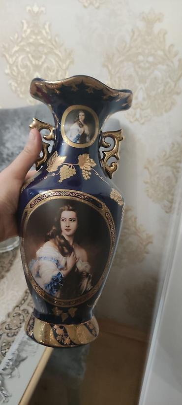 Məhsul: Dekorativ vaz(sınığı var) Təsvir: - Material: Şüşə/porşelen görünüşlü, parlaq səth - Rəng: Tünd göy (kobalt) əsas ton, üst kənarda qızılı haşiyə - Bəzək: Boyun hissəsində zərif qızılı orna...