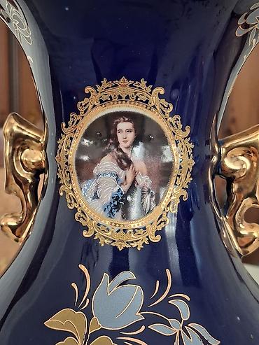 Dekorativ porselen vaza - Klassik üslubda, hündür siluetli dekorativ vaza - Parlaq tünd-mavi (demək olar ki, qara) fon üzərində zəngin qızılı ornamentlər - İki yan tərəfdə dekorativ qulplar və boy...