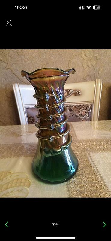 Şüşə vaza – bəzəkli, əl işləməsi - Material: qalın şüşə - Rəng: göyüşün yaşılı gövdə, üst və alt hissədə qızılı örtük - Dekor: qabarıq 3D çiçək aplikasiyaları (ağ-sarı ləçəklər, incə yaşıl vuruşla...