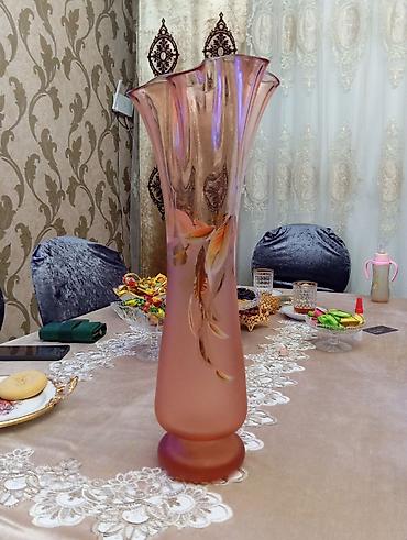 Şüşə vaza – bəzəkli - Material: qalın şüşə - Rəng: tünd zeytun/yaşıl ton - Üslub: klassik - Üzərində qızılı naxışlı güllər və yarpaqlar - Ağız hissəsi geniş, boğazı dar, gövdəsi dolğun formadadır ...