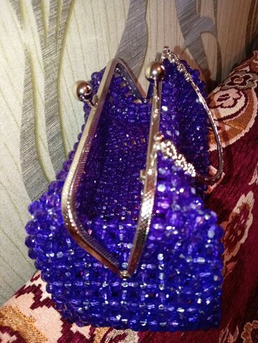 Mavi muncuq çanta - Material: Oval formalı parlaq mavi akril/plastik muncuqlar və şəffaf kristalvari ara muncuqlar - Rəng: Kobalt mavi, şəffaf bəzəklərlə - Dizayn: Tamamilə muncuqlarla toxunmuş ko...