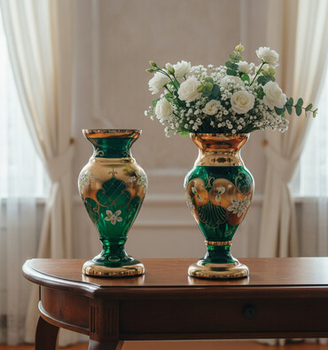 Böhm üslublu dekorativ vaza cütü - Material: qalın şüşə - Rənglər: dərin yaşıl və parlaq qızılı tonlar - Dekor: əl işi qabarıq çiçək naxışları, qızılı ornamentlər, mərkəzdə medalyon motivləri - F...