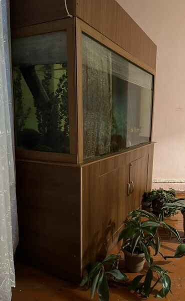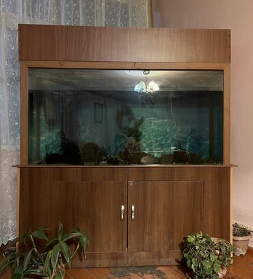 Böyük həcmli akvarium komplekti - Ön şüşəsi qövs formalıdır, geniş baxış bucağı yaradır. - Üst hissəsi taxta dekorativ çərçivə ilə, alt hissəsi isə uyğun taxta tumbalı stendlədir; şkaf bölmələri a...