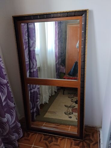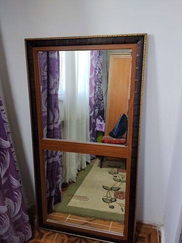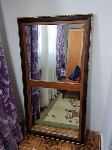 Tam ölçülü güzgü – taxta çərçivəli. - Ölçü: təxmini boydan-boya, dar və uzun forma (paltargom/giriş üçün ideal). - Çərçivə: qəhvəyi taxta, klassik profilli kənarlar. - Montaj: qapıya və ya divara ...