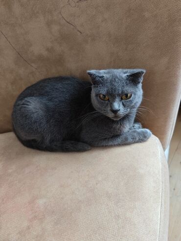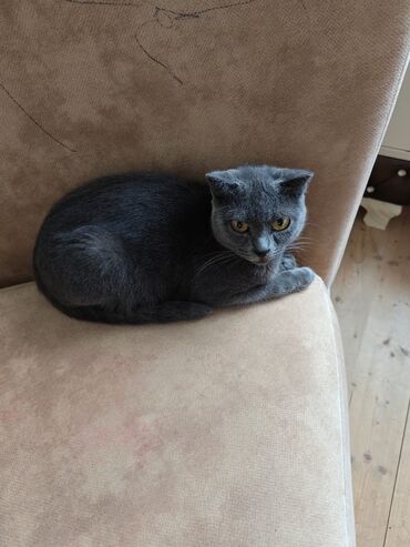 Skottiş Fold balası – boz (blue) rəng - Cins: Scottish Fold (yumuşaq qatlanan qulaqlar) - Rəng: vahid tünd-boz (blue), sıx və parlaq xəz - Gözlər: iri, bal rənginə çalan, ifadəli - Xasiyyət: mehri...
