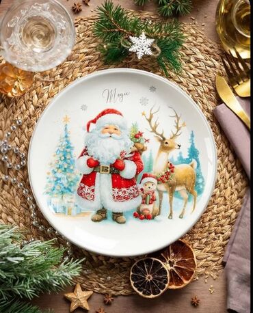 Yeni il temalı boşqablar dəsti – 12 eded,20 sm.Новогодние керамические тарелки,12 шт.дм.20 см. - Dizayn: Mərkəzdə oyuncaqlar və hədiyyələrlə bəzədilmiş Şaxta baba şam ağacı, kənarında qırmızı-yaşı...Giriş•Qeydiyyat