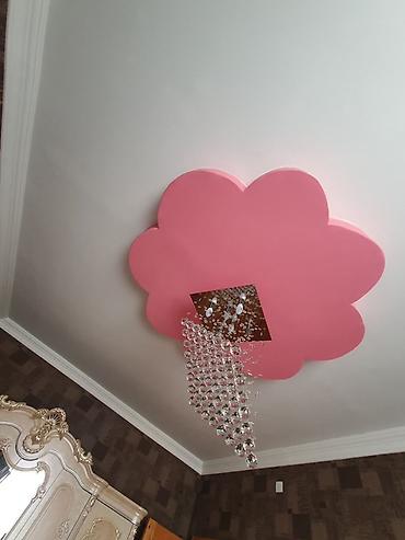 - Pəncərəli/pink dekorlu variant: tavanın ortasında çəhrayı bulud formalı dekor paneli və ortasında güzgülü əsas; şəffaf kristal asmalar kaskad effekti yaradır. Uşaq otağı, boudoir və ya xüsusi dizayn məkanlarına rəng qatır.