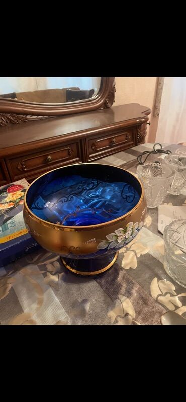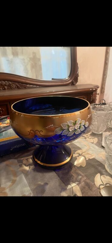 Hamısı təzədir. Qiymətdə endirim olacaq. Göy meyvə vazı və səbət hərəsindən 2 Ədəddir.Kobalt-mavi şüşədən dekorativ səbət. Qabın üstü qızılı naxışlarla bəzədilib, dalğalı ağız kənarı və bükülü qulp...