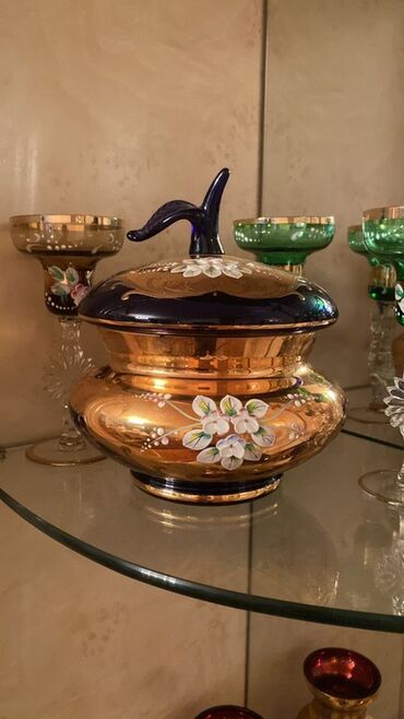 Boqema dekorativ qab – qapaqlı, ayaqlı, əl işləri ilə bəzədilmiş. - Material: boqem şüşəsu/porşelen qalın korpus - Rənglər: qızılı əsas, bənövşəyi-bordo detallarla - Dizayn: qapaqlı, üstündə toppu...