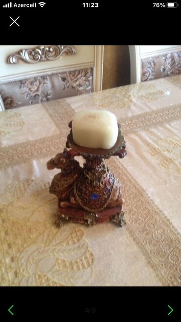 - Şərq üslublu şamaltı: dəvə fiquru formasında dekorativ şamqabı. Detallı relyef işləmələr, zəncirvari bəzəklər və mavi daşla vurğulanmış ornamentlər. Üst hissəsində silindrik ağ şam üçün dayaq. Masa, konsol və ya vitrin üçün dekor aksent.