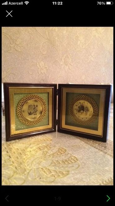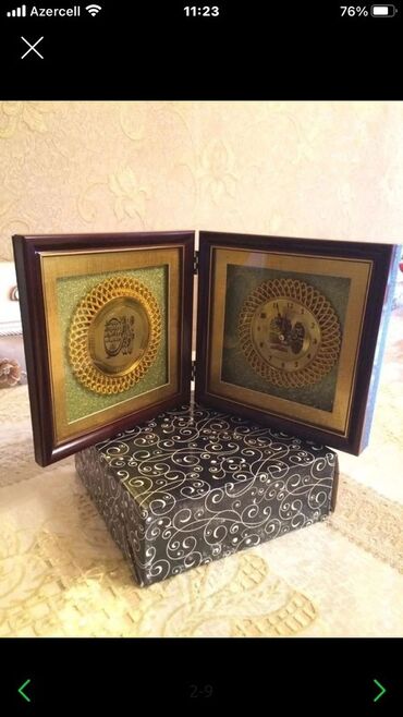 - İkili çərçivə saatlı tablo: menteşəli taxta çərçivə, hər iki tərəfi açılan kitab formasında. Sol paneldə qızılı ornament fonunda kalliqrafik yazı, sağ paneldə mərkəzdə klassik analoq saat (rəqəmlər 1–12), ətrafında qızılı həndəsi naxış. Dəst qutusuyla birlikdə təqdim olunur.