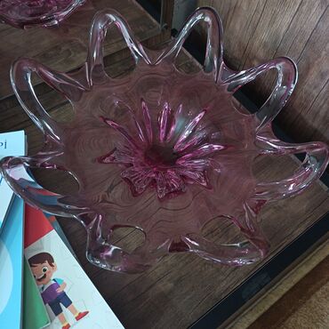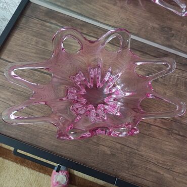 Şüşə dekorativ vaza/meyvəqabı - Rəng: şəffaf baza üzərində qranat-çəhrayı (gradient keçidli) - Material: qalın, ağırlıqlı şüşə - Dizayn: əl işi üslubunda dalğalı və “alov” formalı çıxıntılar; üst ...