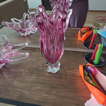 Bədii şüşə vaza - Material: qalın, büllur tipli şüşə - Rəng keçidi: şəffaf əsasdan tünd çəhrayı/mağenta tonlarına keçid - Dizayn: üst hissəsi dalğa və damla formasında, heykəltəraş üslubunda; yanl...