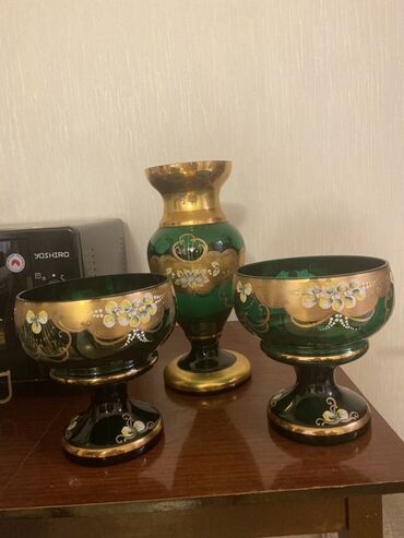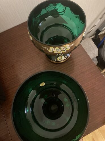 Cütü 20₼...(055) 572 15 81... Dekorativ məqsədlər üçün nəzərdə tutulmuş, qızılı və ağ çiçək naxışları ilə bəzədilmiş tünd göy şüşə qab. Qabın yuxarı kənarı qızılı haşiyə ilə tamamlanıb və ayaqlığı ...