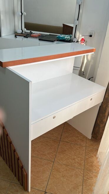 - İş səthi: Geniş, parlaq ağ işləmə masası; üst hissədə əlavə rəf