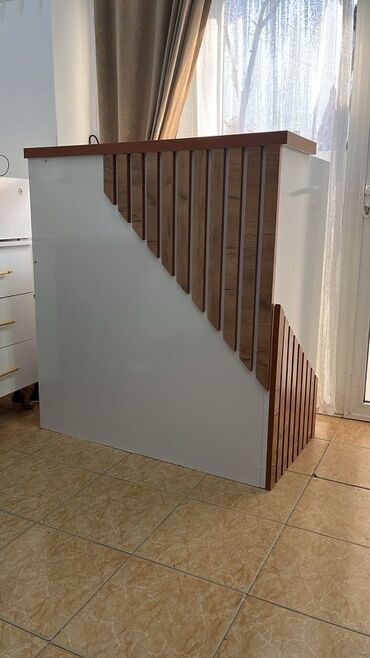 - Material: Ağ rəngli MDF/Laminate səth, qoz tonlarında dekorativ lamellərlə kombinə edilib