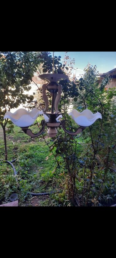 - Asma çilçıraq: 3 plafonlu, klassik dizayn. Ağ şüşə ləçəklı plafonlar, metal/qızılı-qara rəngli qollar, orta hissə dekorativ elementlərlə. Tavana asma baza ilə quraşdırılır, E27 tip lampalara uyğundur (şəkilə əsasən).
