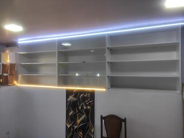 - Arxa divar üçün böyük asma vitrin-rəf sistemi: çoxsaylı geniş rəflər, orta hissəsi sürüşən şüşə qapılı vitrin, yuxarı hissədə LED işıq zolağı.