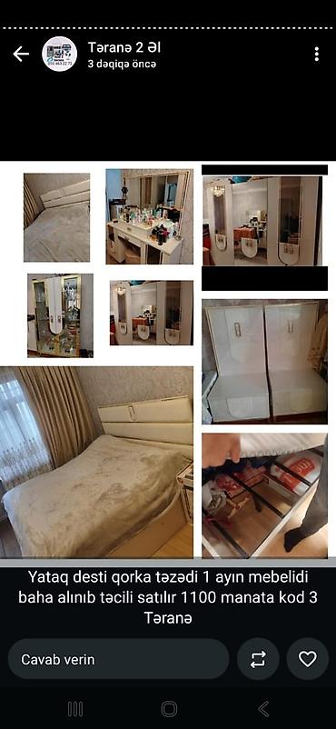 Mətn məlumatı: “Yataq dəsti qorxa təzədi, 1 ayın mebelidi, baha alınıb, təcili satılır, 1100 manata, kod 3, Təranə.”